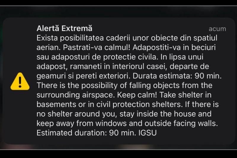 ”În urmă cu puţin timp, Inspectoratul General pentru Situaţii de Urgenţă a transmis un mesaj RO-Alert pentru zona de nord a judeţului Tulcea, prin care cetăţenii au fost informaţi că există posibilitatea căderii unor obiecte din spaţiul aerian şi au fost îndemnaţi să adopte măsuri de protecţie. Durata estimată a alarmei aeriene este de aproximativ 90 de minute”, au precizat reprezentanţii Inspectoratului pentru Situaţii de Urgenţă Tulcea.