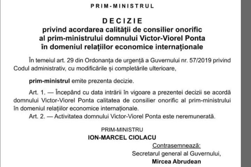 Fostul premier Victor Ponta a devenit consilier onorific al actualului premier Marcel Ciolacu. Decizia privind numirea lui Ponta a fost publicată în Monitorul Oficial. Activitatea nu este remunerată.